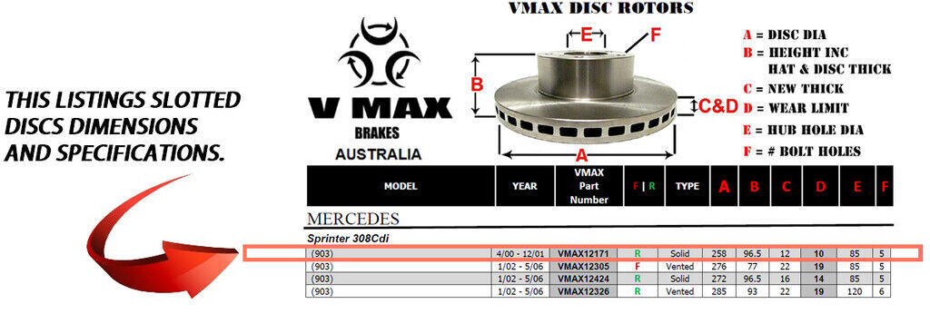 This sale is for a new pair (2 disc rotors) of Genuine VMAX Dimple Drilled & Slotted Performance Rear disc brake rotors and a matching Rear set of brake pads to suit MERCEDES Sprinter 308Cdi 903 models built 2000 till 2001 and are a direct replacement item.