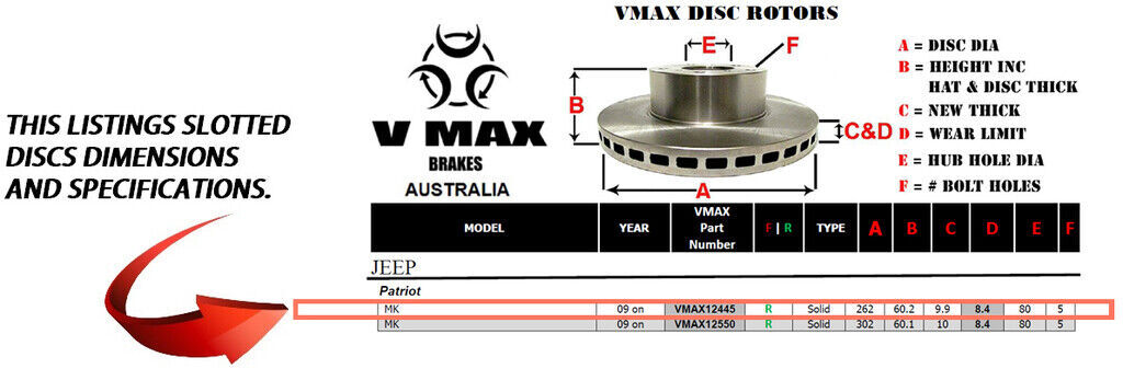 This sale is for a new pair (2 disc rotors) of Genuine VMAX Dimple Drilled & Slotted Performance Rear disc brake rotors to suit JEEP Patriot MK models built 2009 Onwards and are a direct replacement item.
