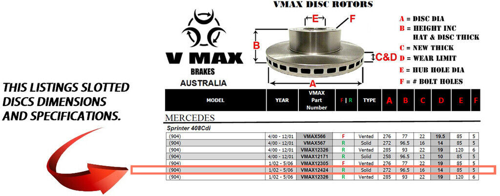 This sale is for a new pair (2 disc rotors) of Genuine VMAX Dimple Drilled & Slotted Performance Rear disc brake rotors and a matching Rear set of brake pads to suit MERCEDES Sprinter 408Cdi 904 models built 2002 till 2006 and are a direct replacement item.