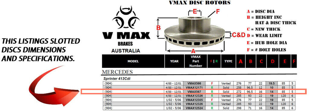 This sale is for a new pair (2 disc rotors) of Genuine VMAX Dimple Drilled & Slotted Performance Rear disc brake rotors and a matching Rear set of brake pads to suit MERCEDES Sprinter 413Cdi 904 models built 2000 till 2001 and are a direct replacement item.