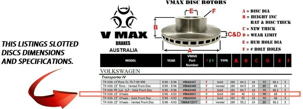 This sale is for a new pair (2 disc rotors) of Genuine VMAX Dimple Drilled & Slotted Performance Rear disc brake rotors to suit VOLKSWAGEN Transporter IV T4 models built 1996 till 2003 and are a direct replacement item.