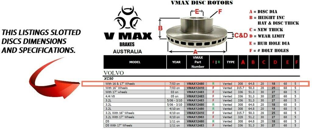 This sale is for a new pair (2 disc rotors) of Genuine VMAX Dimple Drilled & Slotted Performance Rear disc brake rotors to suit VOLVO XC90 models built 2003 Onwards and are a direct replacement item.