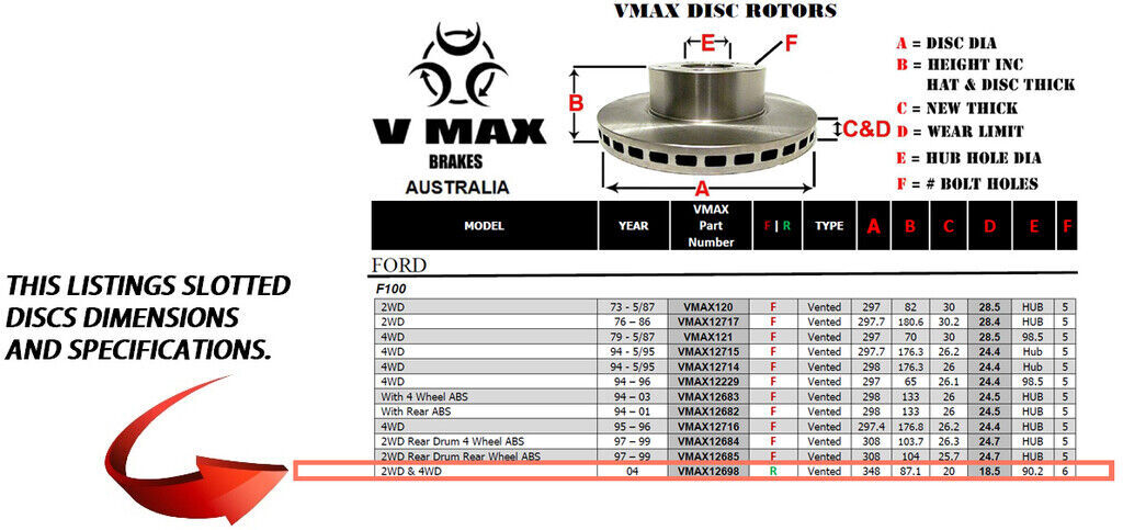 This sale is for a new pair (2 disc rotors) of Genuine VMAX Dimple Drilled & Slotted Performance Rear disc brake rotors and a matching Rear set of brake pads to suit FORD F100 2WD 4WD models built 2004 and are a direct replacement item.
