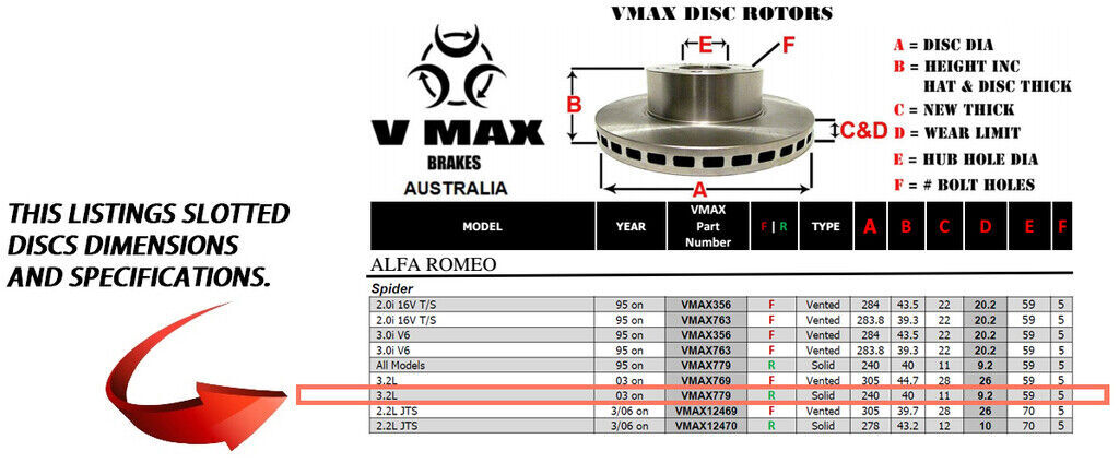 This sale is for a new pair (2 disc rotors) of Genuine VMAX Dimple Drilled & Slotted Performance Rear disc brake rotors and a matching Rear set of brake pads to suit ALFA ROMEO Spider 3.2L models built 2003 Onwards and are a direct replacement item.