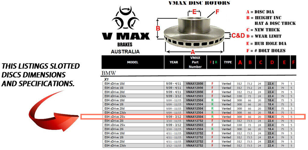 This sale is for a new pair (2 disc rotors) of Genuine VMAX Dimple Drilled & Slotted Performance Rear disc brake rotors and a matching Rear set of brake pads to suit BMW X1 E84 xDrive 25ix models built 2009 till 2012 and are a direct replacement item.