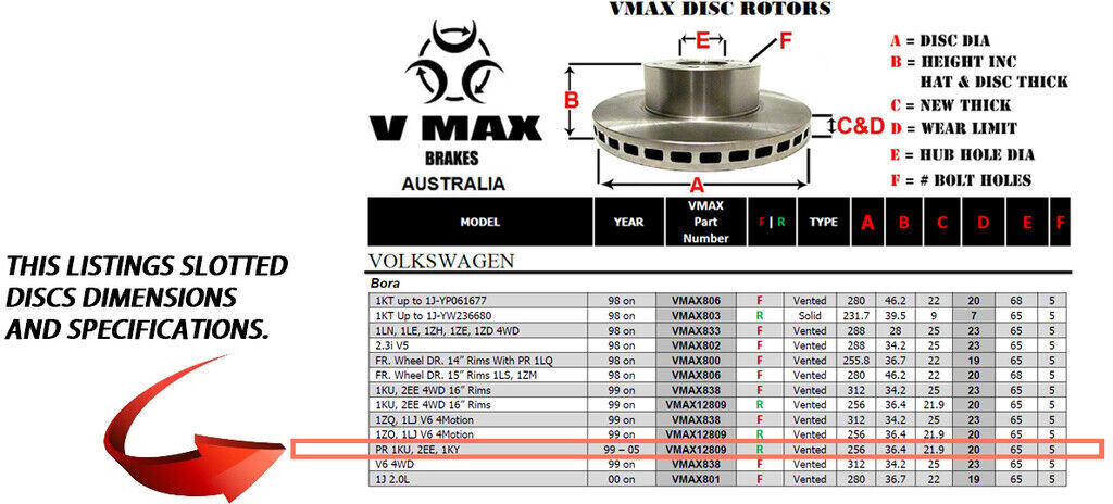 This sale is for a new pair (2 disc rotors) of Genuine VMAX Dimple Drilled & Slotted Performance Rear disc brake rotors and a matching Rear set of brake pads to suit VOLKSWAGEN Bora PR 1KU 2EE 1KY models built 1999 till 2005 and are a direct replacement item.