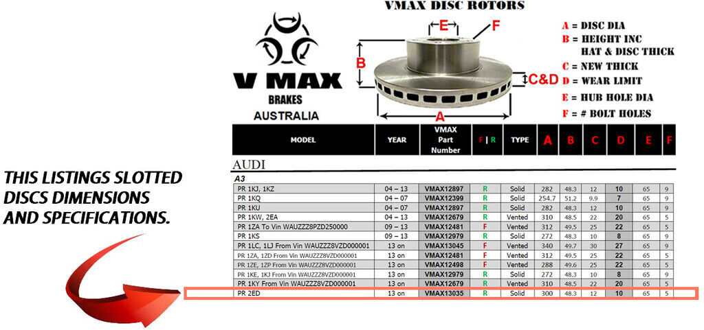 This sale is for a new pair (2 disc rotors) of Genuine VMAX Dimple Drilled & Slotted Performance Rear disc brake rotors and a matching Rear set of brake pads to suit AUDI A3 PR 2ED models built 2013 Onwards and are a direct replacement item.