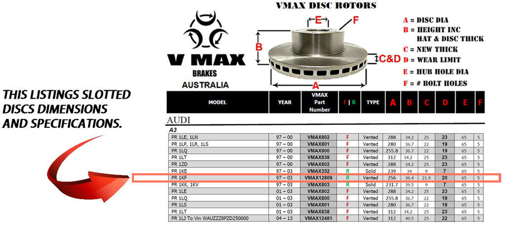 This sale is for a new pair (2 disc rotors) of Genuine VMAX Dimple Drilled & Slotted Performance Rear disc brake rotors and a matching Rear set of brake pads to suit AUDI A3 PR 1KF models built 1997 till 2003 and are a direct replacement item.