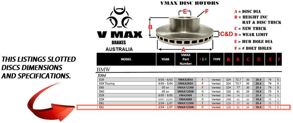 This sale is for a new pair (2 disc rotors) of Genuine VMAX Dimple Drilled & Slotted Performance Rear disc brake rotors and a matching Rear set of brake pads to suit BMW 530d E61 models built 2004 till 2007 and are a direct replacement item.