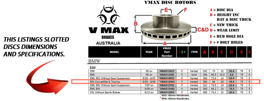 This sale is for a new pair (2 disc rotors) of Genuine VMAX Dimple Drilled & Slotted Performance Rear disc brake rotors and a matching Rear set of brake pads to suit BMW 320i E91 Convertible Touring models built 2005 till 2009 and are a direct replacement item.