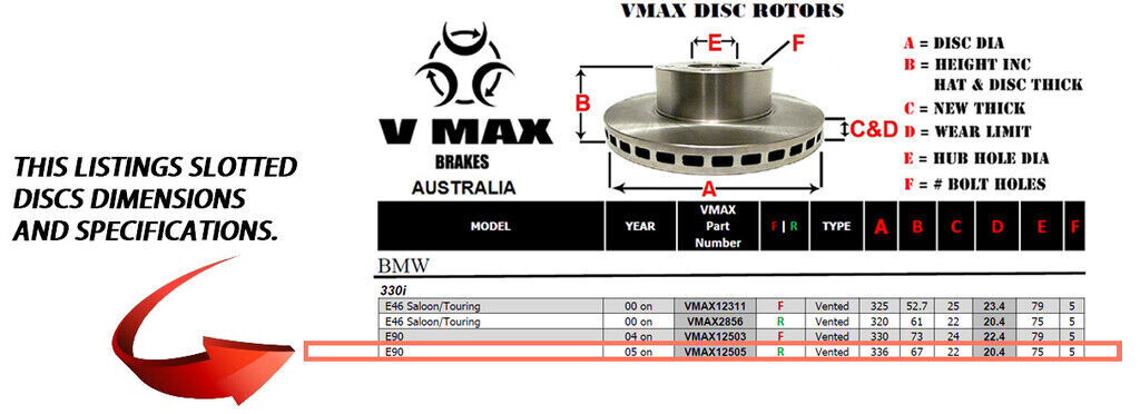 This sale is for a new pair (2 disc rotors) of Genuine VMAX Dimple Drilled & Slotted Performance Rear disc brake rotors and a matching Rear set of brake pads to suit BMW 330i E90 models built 2005 Onwards and are a direct replacement item.