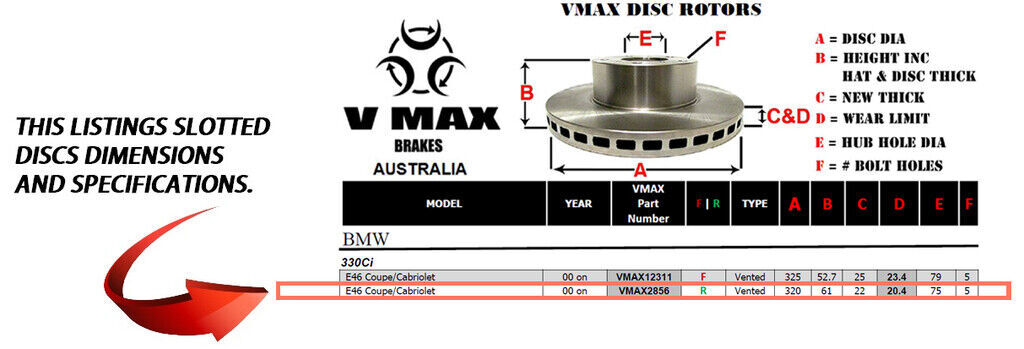This sale is for a new pair (2 disc rotors) of Genuine VMAX Dimple Drilled & Slotted Performance Rear disc brake rotors and a matching Rear set of brake pads to suit BMW 330Ci E46 Coupe Cabriolet models built 2000 Onwards and are a direct replacement item.
