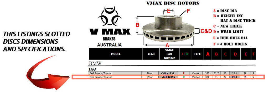 This sale is for a new pair (2 disc rotors) of Genuine VMAX Dimple Drilled & Slotted Performance Rear disc brake rotors and a matching Rear set of brake pads to suit BMW 330d E46 Saloon Touring models built 1999 Onwards and are a direct replacement item.