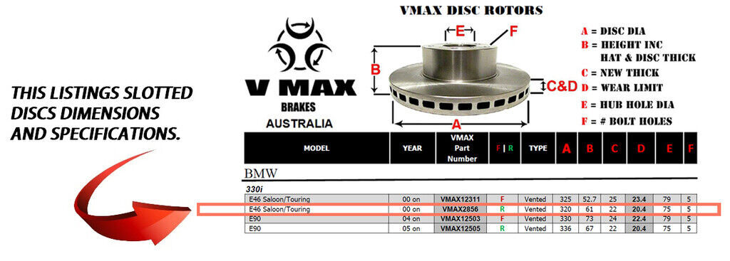 This sale is for a new pair (2 disc rotors) of Genuine VMAX Dimple Drilled & Slotted Performance Rear disc brake rotors and a matching Rear set of brake pads to suit BMW 330i E46 Saloon Touring models built 2000 Onwards and are a direct replacement item.