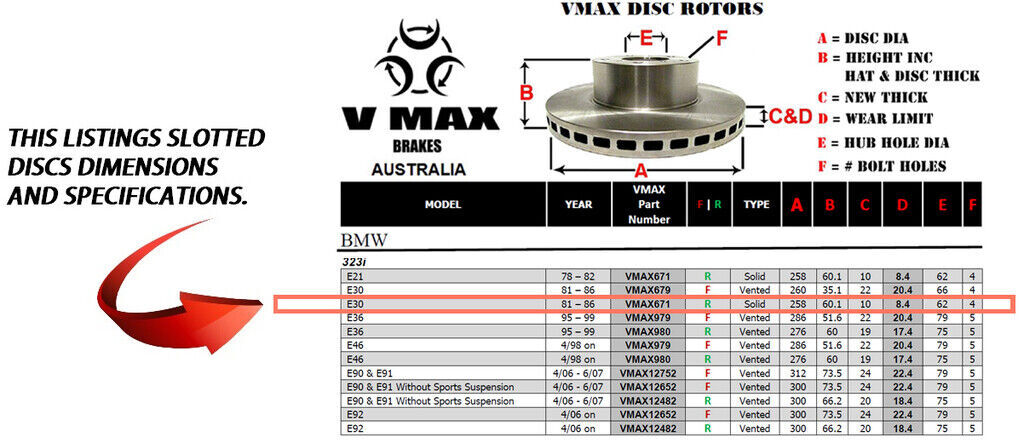 This sale is for a new pair (2 disc rotors) of Genuine VMAX Dimple Drilled & Slotted Performance Rear disc brake rotors and a matching Rear set of brake pads to suit BMW 323i E30 models built 1981 till 1986 and are a direct replacement item.