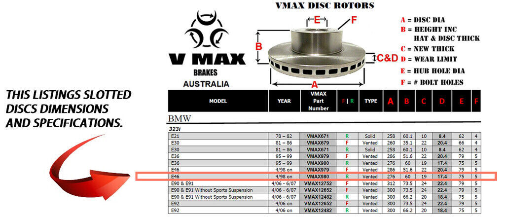 This sale is for a new pair (2 disc rotors) of Genuine VMAX Dimple Drilled & Slotted Performance Rear disc brake rotors and a matching Rear set of brake pads to suit BMW 323i E46 models built 1998 Onwards and are a direct replacement item.