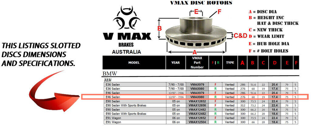 This sale is for a new pair (2 disc rotors) of Genuine VMAX Dimple Drilled & Slotted Performance Rear disc brake rotors and a matching Rear set of brake pads to suit BMW 323i E46 Sedan models built 1997 till 2006 and are a direct replacement item.