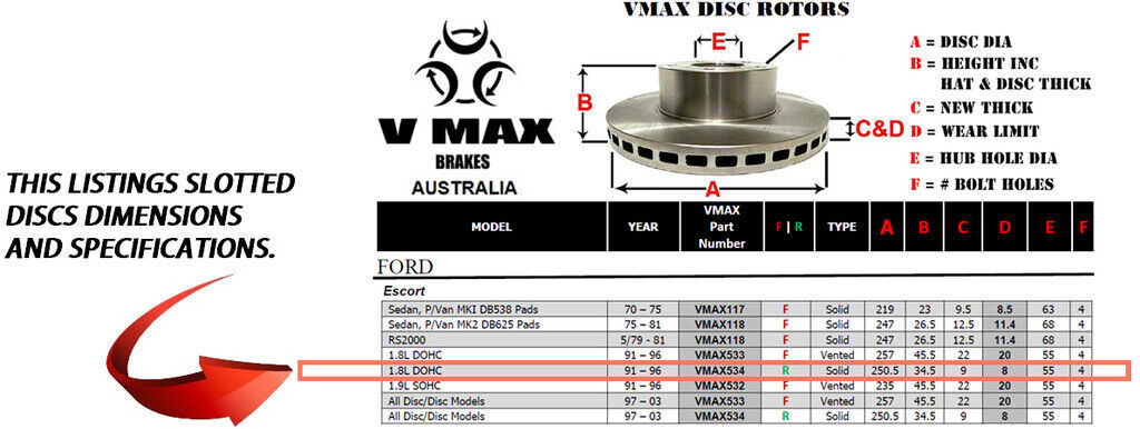 This sale is for a new pair (2 disc rotors) of Genuine VMAX Dimple Drilled & Slotted Performance Rear disc brake rotors and a matching Rear set of brake pads to suit FORD Escort 1.8L DOHC models built 1991 till 1996 and are a direct replacement item.