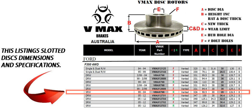 This sale is for a new pair (2 disc rotors) of Genuine VMAX Dimple Drilled & Slotted Performance Rear disc brake rotors and a matching Rear set of brake pads to suit FORD F350 4WD SRW models built 1999 till 2004 and are a direct replacement item.
