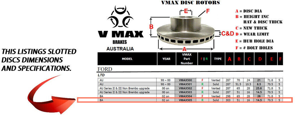 This sale is for a new pair (2 disc rotors) of Genuine VMAX Dimple Drilled & Slotted Performance Rear disc brake rotors and a matching Rear set of brake pads to suit FORD LTD BA models built 2002 Onwards and are a direct replacement item.