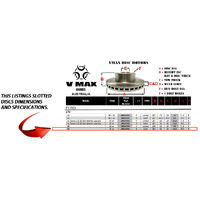 VMAX Rotors are Australian engineered of the highest quality high carbon content hardened cast iron, final machining is done by here in Melbourne in VMAX's Engineering Department, they are Dimpled, Slotted, Balanced, Hardness and Runout tested against manufacturing defects for a full 18m/30,000Km.