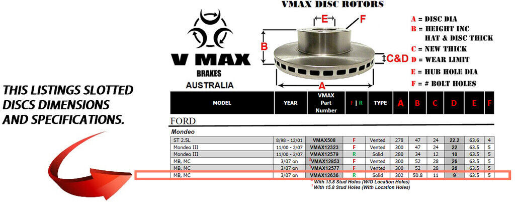 This sale is for a new pair (2 disc rotors) of Genuine VMAX Dimple Drilled & Slotted Performance Rear disc brake rotors and a matching Rear set of brake pads to suit FORD Mondeo MB MC models built 2007 Onwards and are a direct replacement item.