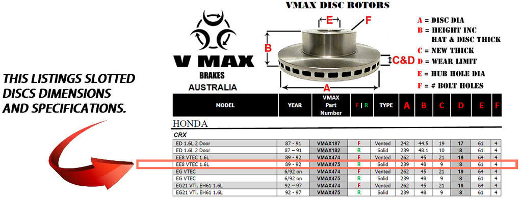 This sale is for a new pair (2 disc rotors) of Genuine VMAX Dimple Drilled & Slotted Performance Rear disc brake rotors and a matching Rear set of brake pads to suit HONDA CRX EE8 VTEC 1.6L models built 1989 till 1992 and are a direct replacement item.