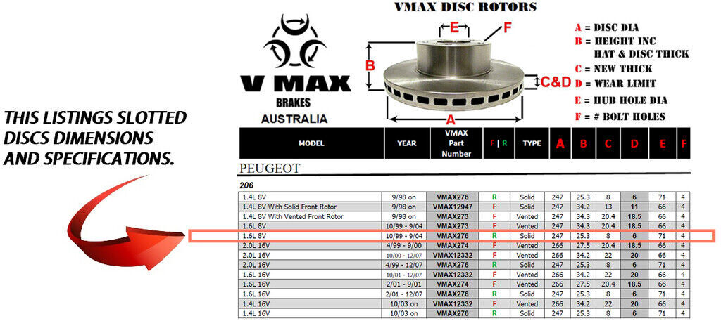 This sale is for a new pair (2 disc rotors) of Genuine VMAX Dimple Drilled & Slotted Performance Rear disc brake rotors and a matching Rear set of brake pads to suit PEUGEOT 206 1.6L 8V models built 1999 till 2004 and are a direct replacement item.