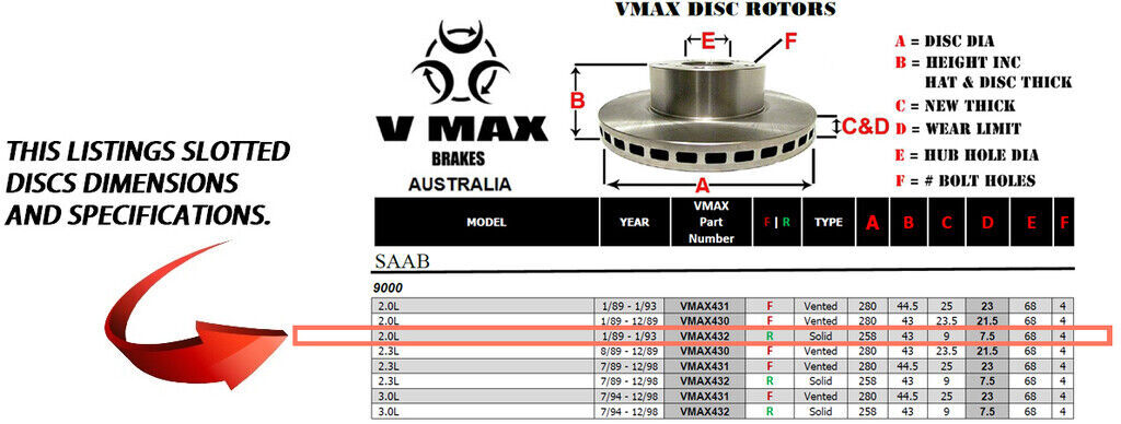 This sale is for a new pair (2 disc rotors) of Genuine VMAX Dimple Drilled & Slotted Performance Rear disc brake rotors and a matching Rear set of brake pads to suit SAAB 9000 2.0L models built 1989 till 1993 and are a direct replacement item.