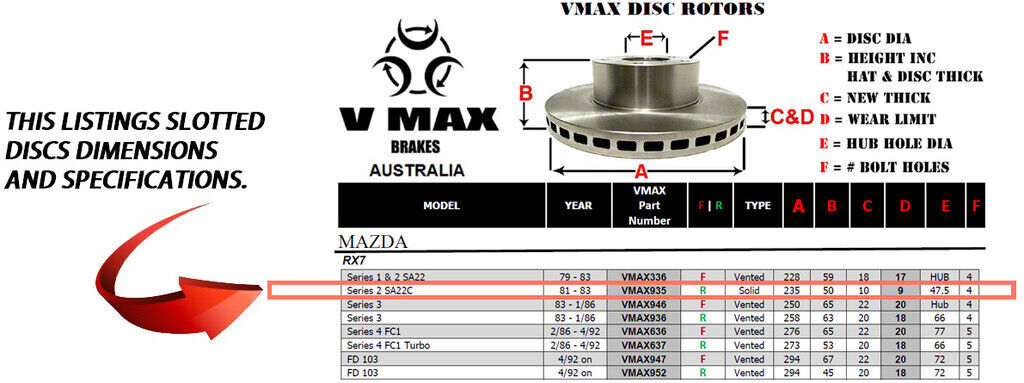This sale is for a new pair (2 disc rotors) of Genuine VMAX Dimple Drilled & Slotted Performance Rear disc brake rotors to suit MAZDA RX7 Series 2 SA22C models built 1981 till 1983 and are a direct replacement item.