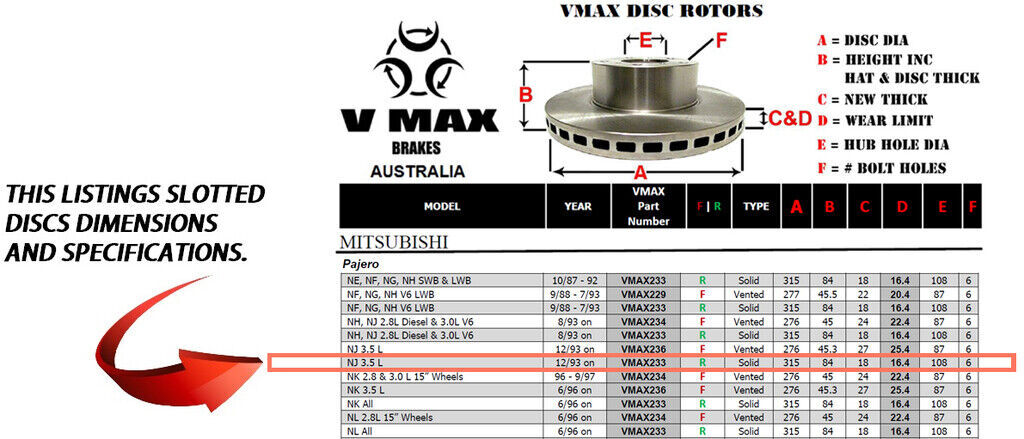This sale is for a new pair (2 disc rotors) of Genuine VMAX Dimple Drilled & Slotted Performance Rear disc brake rotors to suit MITSUBISHI Pajero NJ 3.5 L models built 1993 Onwards and are a direct replacement item.