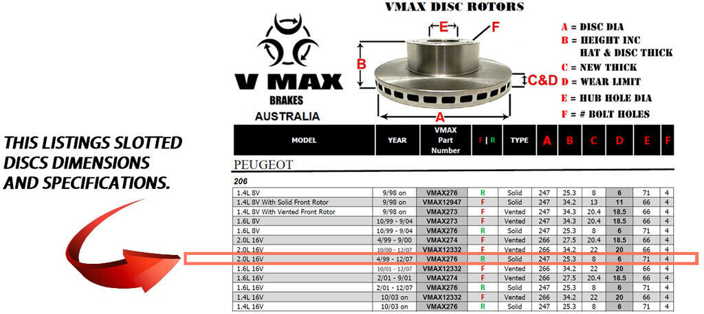 This sale is for a new pair (2 disc rotors) of Genuine VMAX Dimple Drilled & Slotted Performance Rear disc brake rotors to suit PEUGEOT 206 2.0L 16V models built 1999 till 2007 and are a direct replacement item.