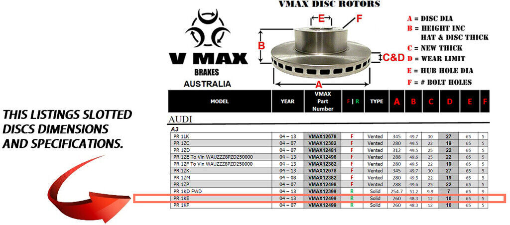 This sale is for a new pair (2 disc rotors) of Genuine VMAX Dimple Drilled & Slotted Performance Rear disc brake rotors to suit AUDI A3 PR 1KE models built 2004 till 2013 and are a direct replacement item.