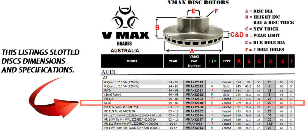 This sale is for a new pair (2 disc rotors) of Genuine VMAX Dimple Drilled & Slotted Performance Rear disc brake rotors to suit AUDI A8 Solid models built 1999 till 2003 and are a direct replacement item.
