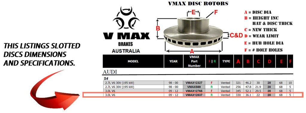 This sale is for a new pair (2 disc rotors) of Genuine VMAX Dimple Drilled & Slotted Performance Rear disc brake rotors to suit AUDI S4 3.0L V6 models built 2009 till 2012 and are a direct replacement item.