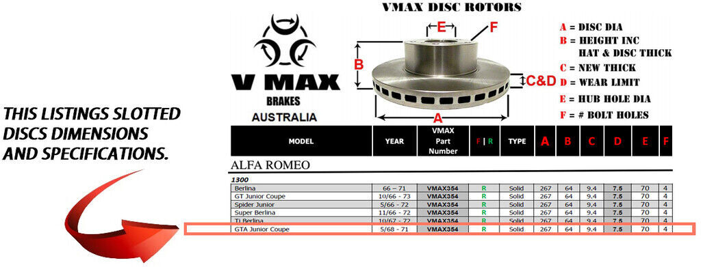 This sale is for a new pair (2 disc rotors) of Genuine VMAX Dimple Drilled & Slotted Performance Rear disc brake rotors to suit ALFA ROMEO 1300 GTA Junior Coupe models built 1968 till 1971 and are a direct replacement item.