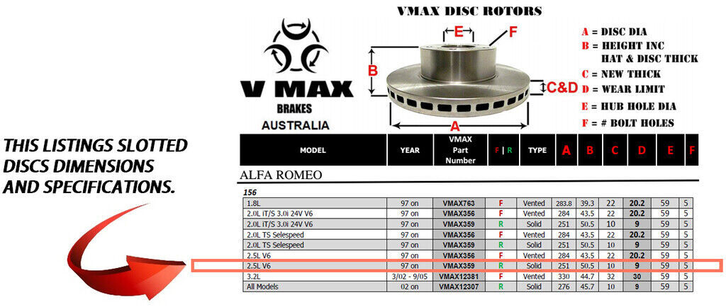 This sale is for a new pair (2 disc rotors) of Genuine VMAX Dimple Drilled & Slotted Performance Rear disc brake rotors to suit ALFA ROMEO 156 2.5L V6 models built 1997 Onwards and are a direct replacement item.