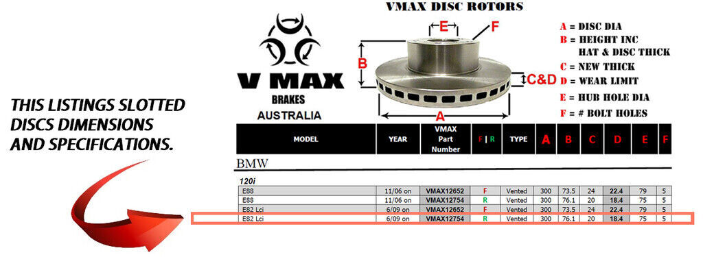 This sale is for a new pair (2 disc rotors) of Genuine VMAX Dimple Drilled & Slotted Performance Rear disc brake rotors to suit BMW 120i E82 Lci models built 2009 Onwards and are a direct replacement item.