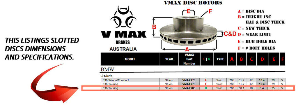 This sale is for a new pair (2 disc rotors) of Genuine VMAX Dimple Drilled & Slotted Performance Rear disc brake rotors to suit BMW 318tds E36 Touring models built 1994 Onwards and are a direct replacement item.