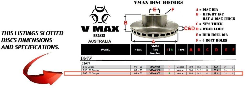 This sale is for a new pair (2 disc rotors) of Genuine VMAX Dimple Drilled & Slotted Performance Rear disc brake rotors to suit BMW 320Ci E46 LCI Coupe models built 2003 till 2006 and are a direct replacement item.