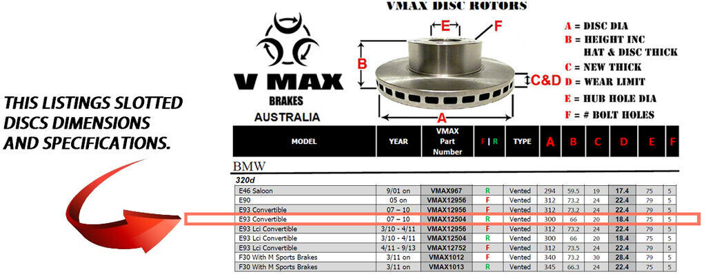 This sale is for a new pair (2 disc rotors) of Genuine VMAX Dimple Drilled & Slotted Performance Rear disc brake rotors to suit BMW 320d E93 Convertible models built 2007 till 2010 and are a direct replacement item.