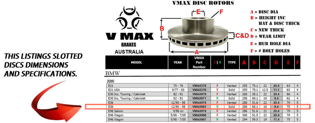 This sale is for a new pair (2 disc rotors) of Genuine VMAX Dimple Drilled & Slotted Performance Rear disc brake rotors to suit BMW 320i E36 models built 1990 till 1998 and are a direct replacement item.