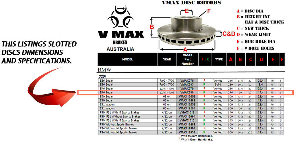 This sale is for a new pair (2 disc rotors) of Genuine VMAX Dimple Drilled & Slotted Performance Rear disc brake rotors to suit BMW 320i E46 Sedan models built 1997 till 2006 and are a direct replacement item.