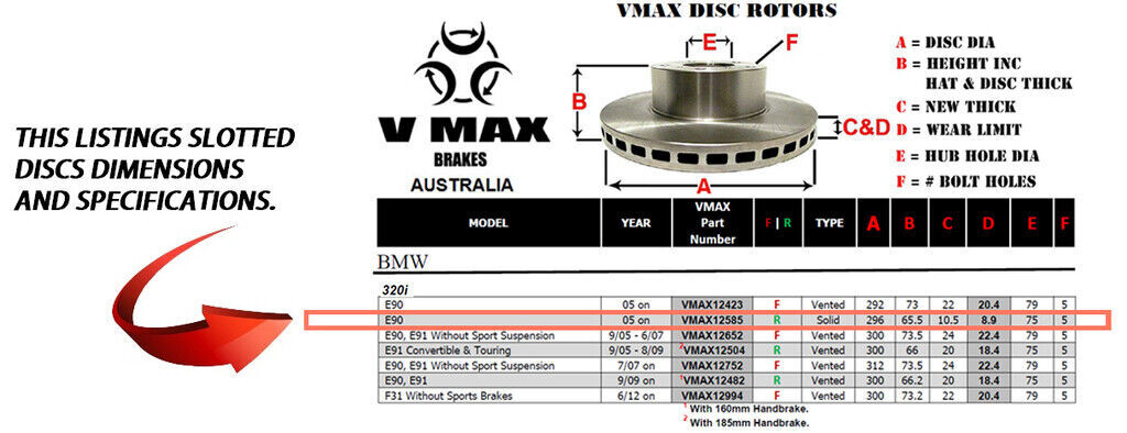 This sale is for a new pair (2 disc rotors) of Genuine VMAX Dimple Drilled & Slotted Performance Rear disc brake rotors to suit BMW 320i E90 models built 2005 Onwards and are a direct replacement item.