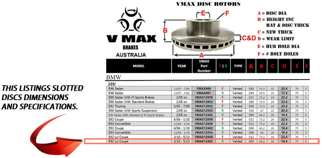 This sale is for a new pair (2 disc rotors) of Genuine VMAX Dimple Drilled & Slotted Performance Rear disc brake rotors to suit BMW 325i E92 Lci Coupe models built 2010 till 2013 and are a direct replacement item.