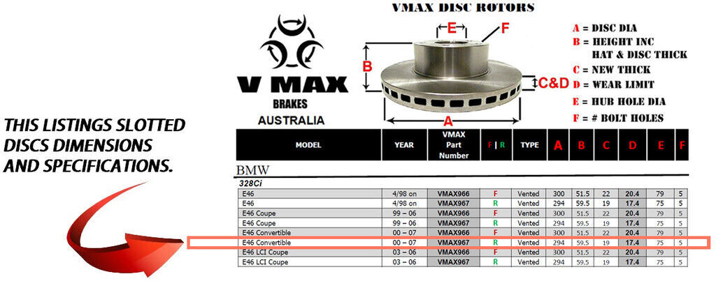This sale is for a new pair (2 disc rotors) of Genuine VMAX Dimple Drilled & Slotted Performance Rear disc brake rotors to suit BMW 328Ci E46 Convertible models built 2000 till 2007 and are a direct replacement item.