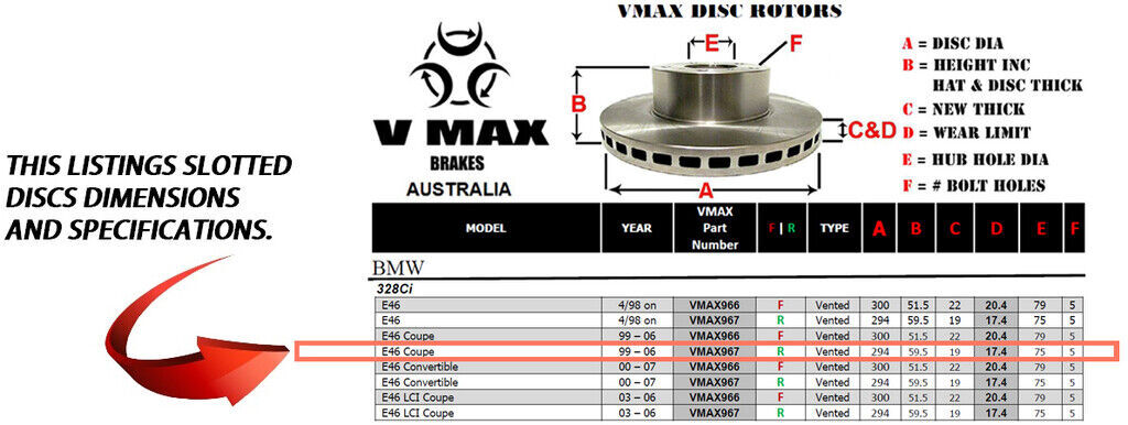 This sale is for a new pair (2 disc rotors) of Genuine VMAX Dimple Drilled & Slotted Performance Rear disc brake rotors to suit BMW 328Ci E46 Coupe models built 1999 till 2006 and are a direct replacement item.