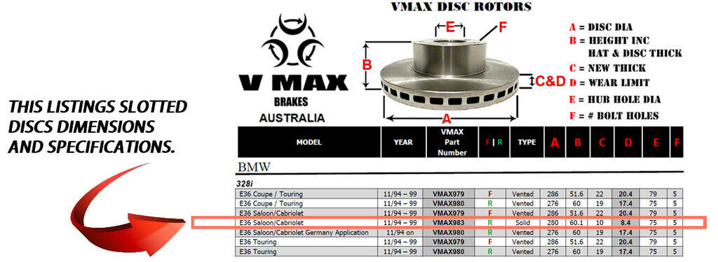 This sale is for a new pair (2 disc rotors) of Genuine VMAX Dimple Drilled & Slotted Performance Rear disc brake rotors to suit BMW 328i E36 Saloon Cabriolet models built 1994 till 1999 and are a direct replacement item.