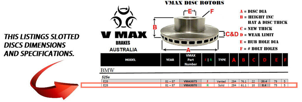 This sale is for a new pair (2 disc rotors) of Genuine VMAX Dimple Drilled & Slotted Performance Rear disc brake rotors to suit BMW 525e E28 models built 1981 till 1987 and are a direct replacement item.