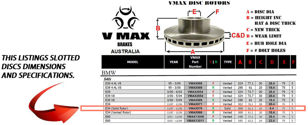 This sale is for a new pair (2 disc rotors) of Genuine VMAX Dimple Drilled & Slotted Performance Rear disc brake rotors to suit BMW 540i E34 Solid Rotor models built 1987 till 1996 and are a direct replacement item.